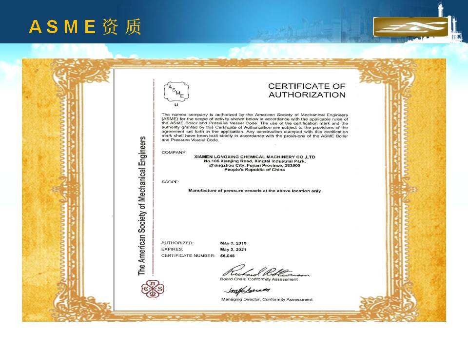 廈門隆興化工機械有限公司成立于2001年5月,占地面積30000平方米,擁有生產(chǎn)車間面積10000平方米及相關(guān)配套的辦公場所3000平方米,其中下料場所1000平方米,不銹鋼制作場所2000平方米,ASME產(chǎn)品制作區(qū)域1200平方米,無損曝光室30平方米。公司有職工135人,擁有專業(yè)的技術(shù)人員和管理人員36人。公司主要從事設計、制造A2級覆蓋D類壓力容器...